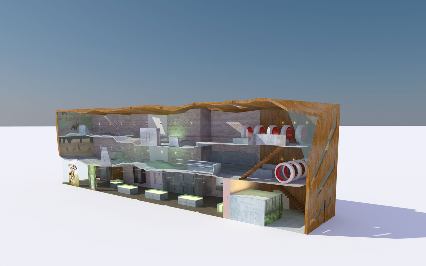 Concept 'De Kruisboogwinkel' te Breda. Renderboys maakte het open gewerkte model en visual van winkel met schietbanen op eerste en tweede verdieping.