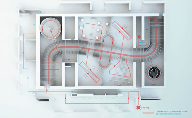Concept presentatie van ontwerp van Theun Mosk. tentoonstelling over Kokoschka, in Boijmans van Beuningen museum, assistent vormgeving, Peter Schermer