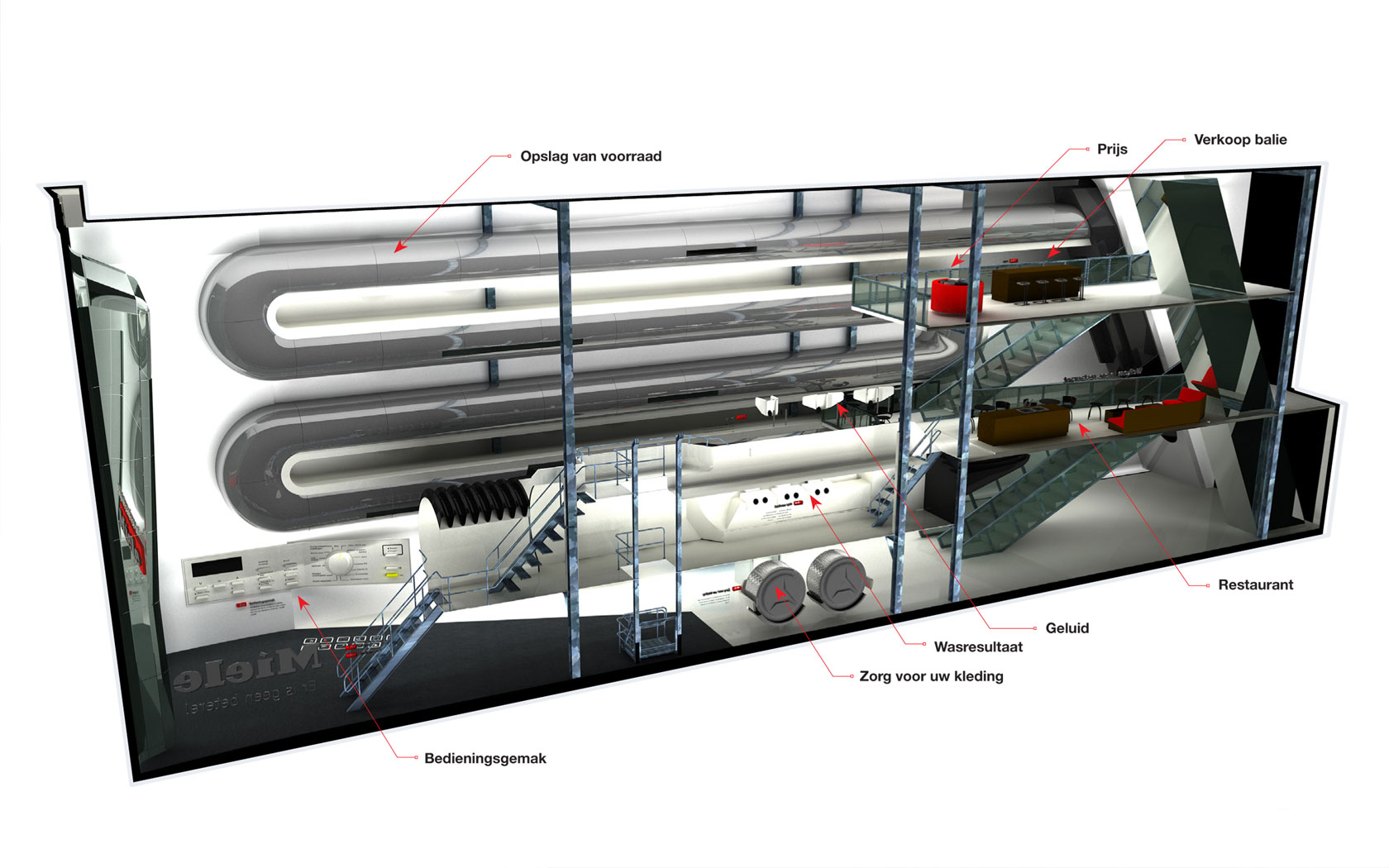 De 'Introperience of Miele' Concept ontwerp van Peter Schermer, ruimtelijk ontwerp. De witgoedzaak van de toekomst. Renderboys maakte het 3d model en visualisaties.