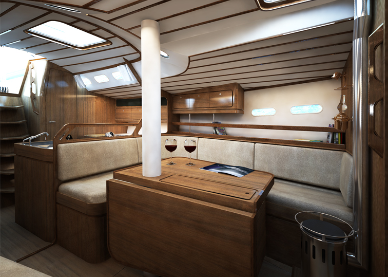 Interieur voor 11 meter lang zeiljacht. Hoofddoel van het ontwerp een goede leefomgeving bieden voor bemaning tijdens lange zeereizen. Hierbij is belangrijk dat het interieur onder helling goed functioneert.