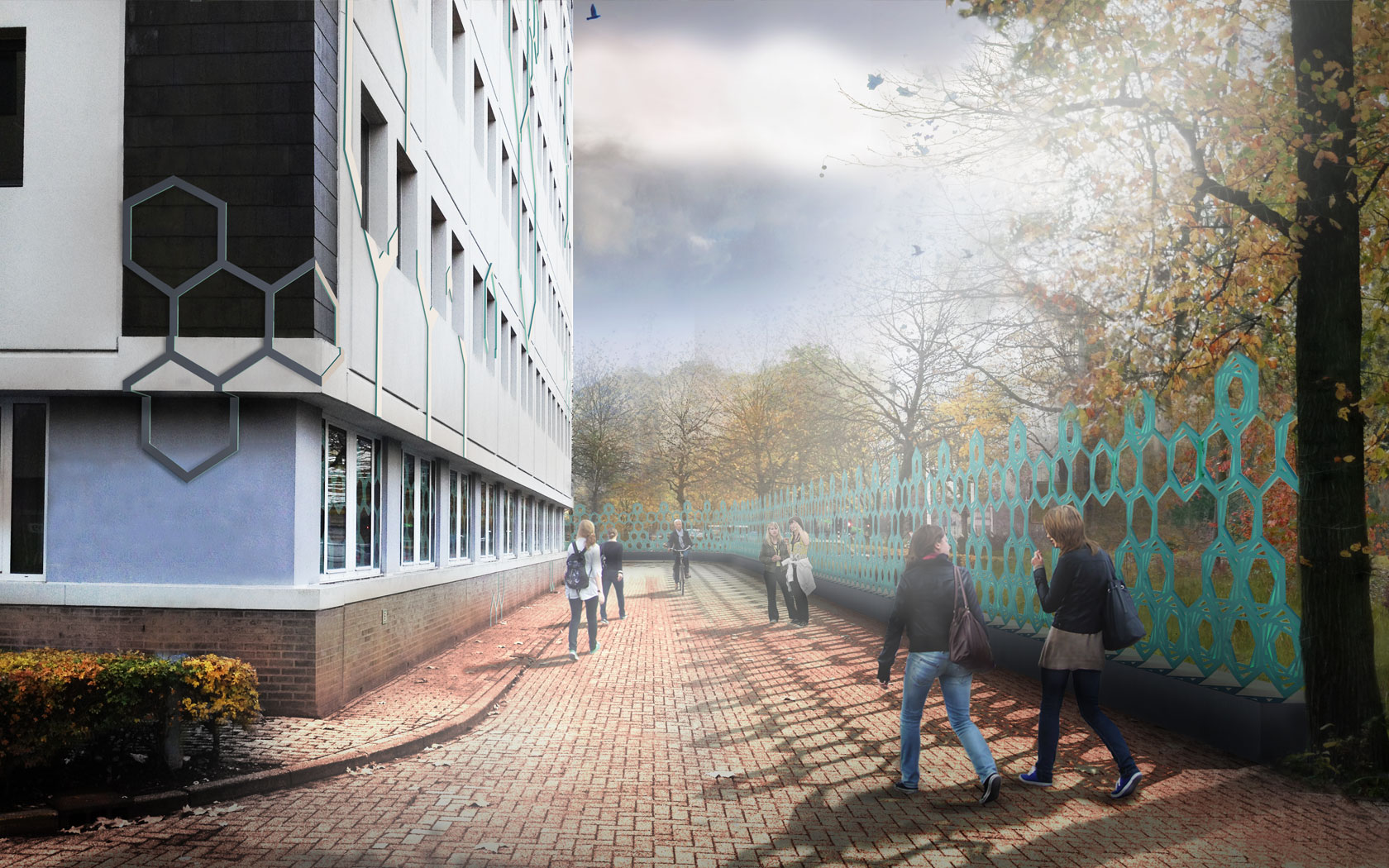 Studio Maatwerk maakt ontwerpen in de openbare ruimte. Voor een scholengemeenschap in Eindhoven ontworpen ze een wandelbrug en een hek. Renderboys maakte vanuit fotomontages en 3d modellen 2 sfeerimpressies.